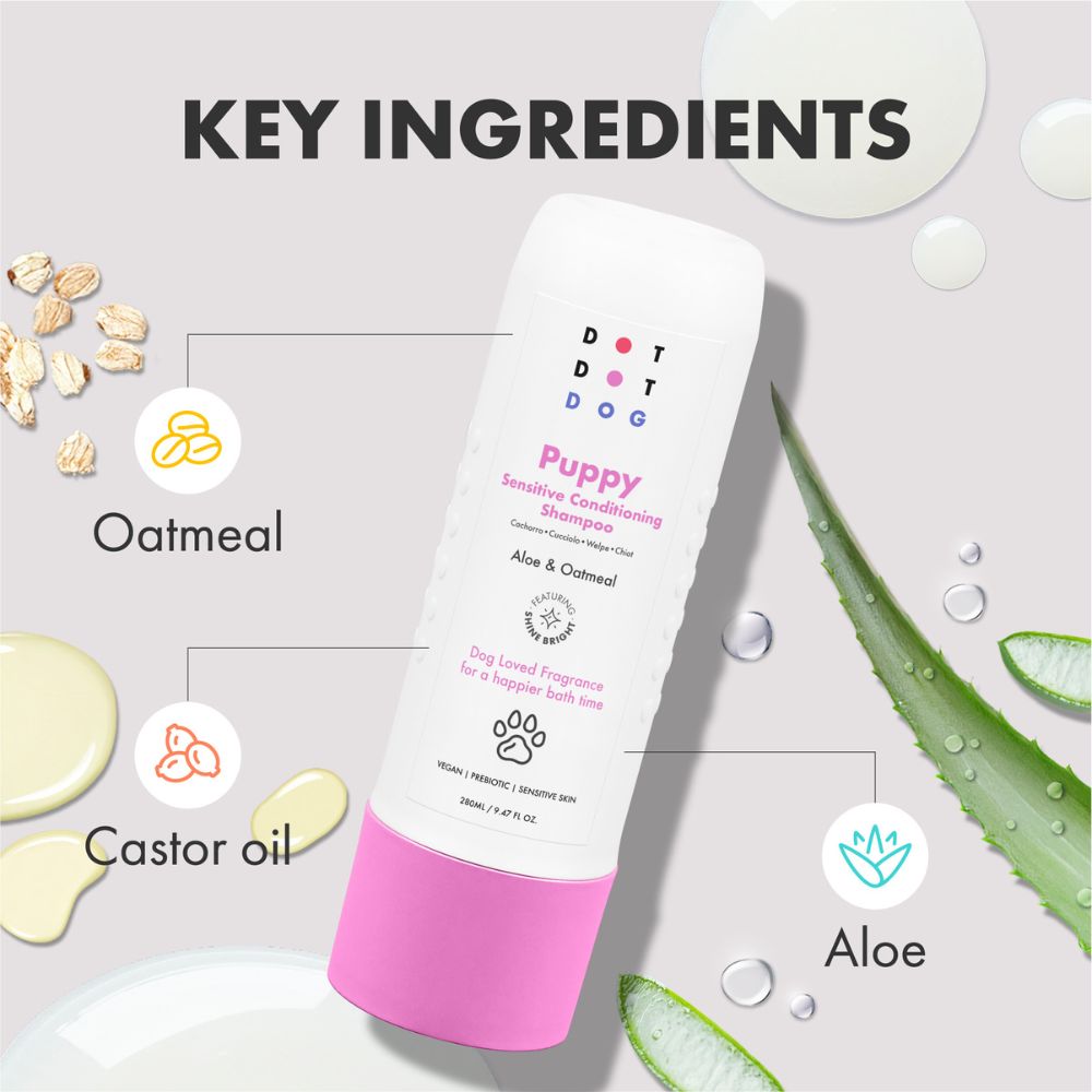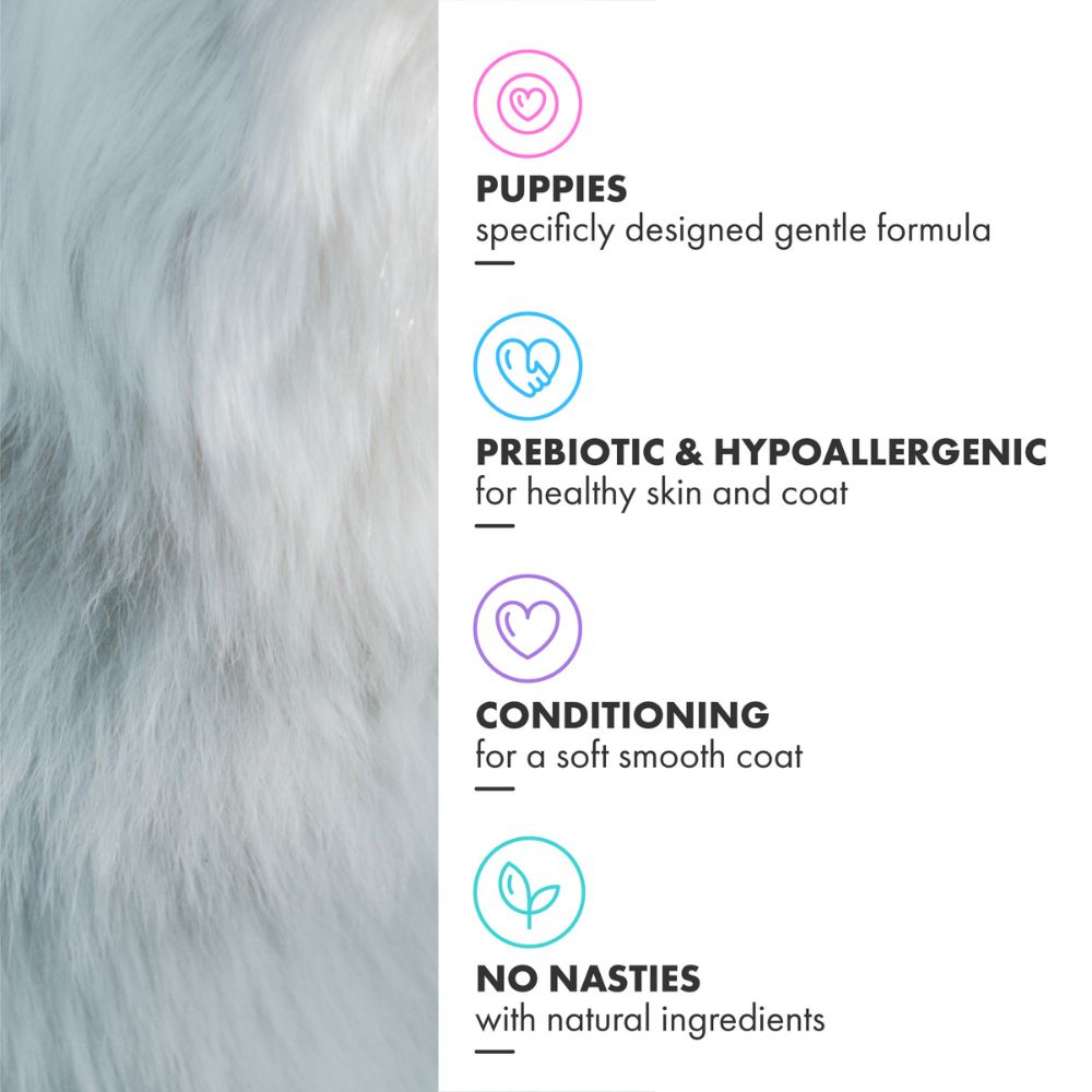 Zeer milde puppyshampoo met haver en aloë vera, speciaal ontwikkeld voor de gevoelige huid van jonge honden. Deze verzorgende formule kalmeert, hydrateert en beschermt de kwetsbare puppyhuid, terwijl de vacht zacht en luchtig blijft. Ideaal voor het opbouwen van een positieve wasroutine vanaf het eerste badmoment.
