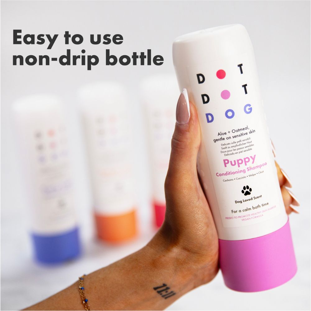 Maak de pup nat met lauw water en breng de shampoo aan langs de rug. Masseer in tot een zachte schuimlaag en verdeel over het hele lichaam. Grondig uitspoelen. De fles opent via de witte dop aan de onderzijde (laat de gekleurde dop gesloten). Dankzij de antidrupfunctie blijft het badmoment schoon en stressvrij.