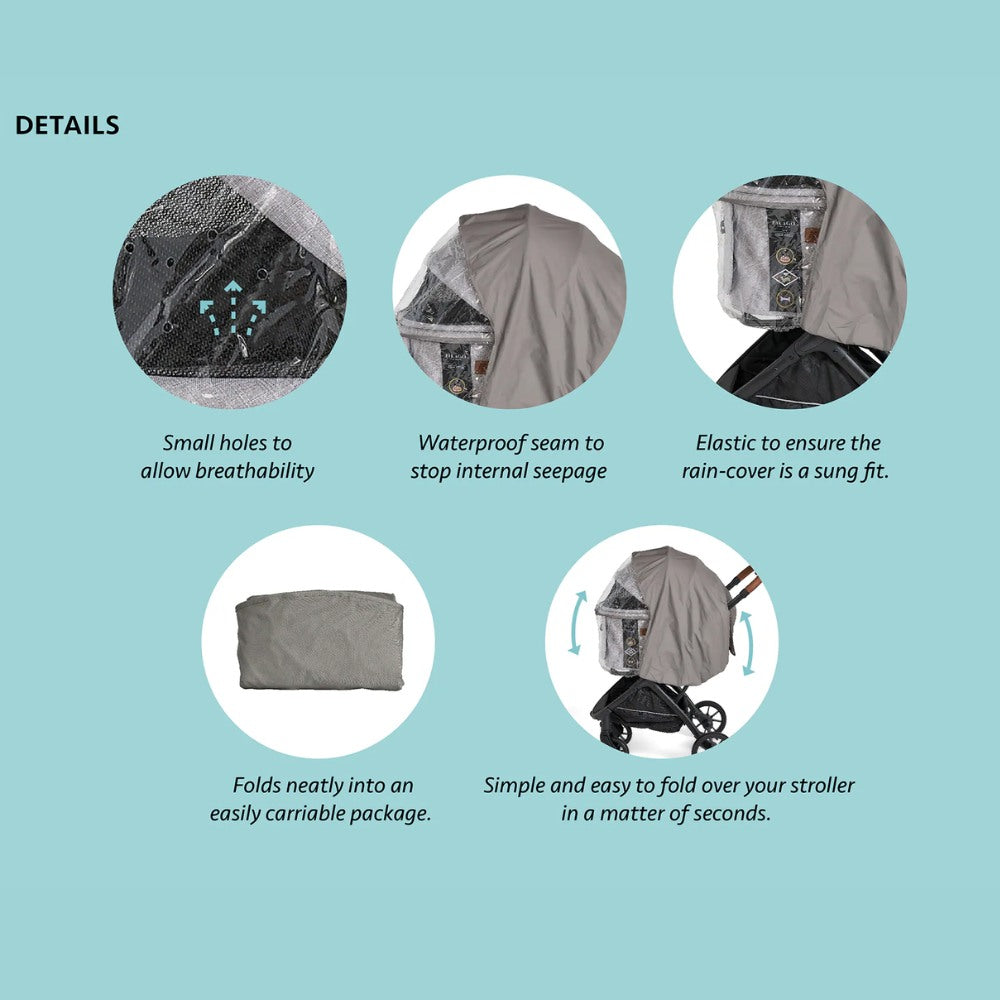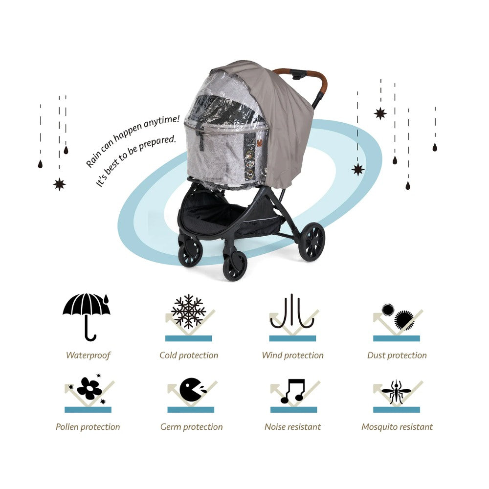 Ontworpen voor comfort en veiligheid, beschermt deze hoes niet alleen tegen regen, maar ook tegen kou, wind, pollen, vervuiling en zelfs insecten. Dankzij de transparante, waterdichte PVC-panelen en het ademende ventilatievenster blijft de luchtcirculatie behouden, wat zorgt voor een aangenaam klimaat in de buggy, zelfs bij nat weer.