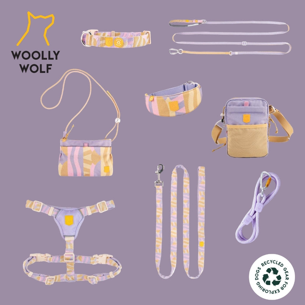 De Woolly Wolf Sunshower collectie bestaat uit bijpassende tuigen, halsbanden, riemen en praktische accessoires in één herkenbare en consistente stijl. De artikelen zijn uitstekend met elkaar te combineren tot een uniforme en duurzame wandeluitrusting binnen hetzelfde design, wat zorgt voor een krachtig en samenhangend aanbod in het winkelschap.