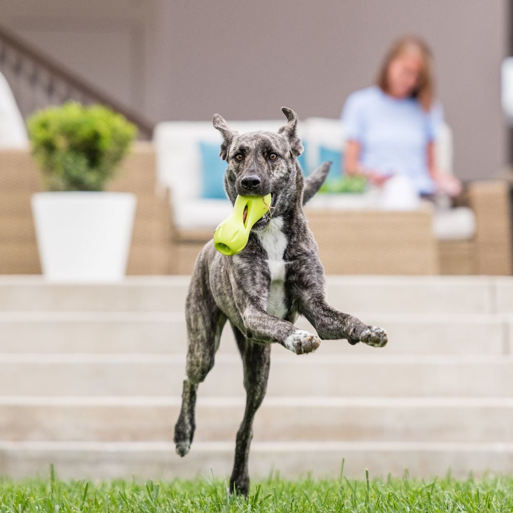 De Qwizl kan ook gebruikt worden om interactief mee te spelen. Als de snacks uit de Qwizl opgegeten zijn, gebruik hem dan om te apporteren. De Qwizl is verkrijgbaar in twee maten, small en large en in de drie kenmerkende Zogoflex kleuren, Aqua Blauw, Tangerine Oranje en Granny Smith Groen.