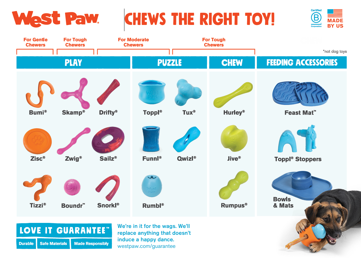 Zogoflex® is een ongelooflijk sterk materiaal dat door West Paw wordt gebruikt om duurzaam hondenspeelgoed van te maken. Deze speeltjes blijven drijven, zijn buigzaam en gaan langer mee dan de meeste andere speeltjes. Alle Zogoflex® speeltjes kunnen in de vaatwasmachine.