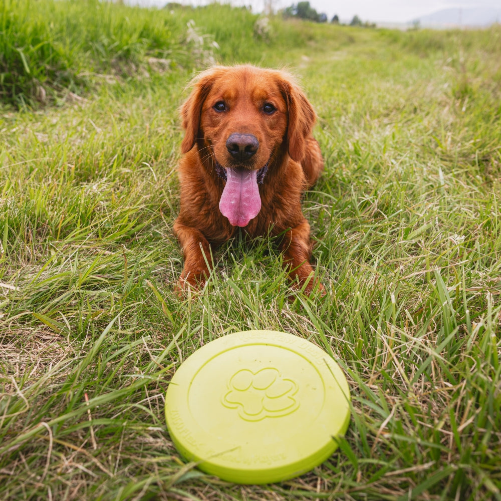 De Zisc flexibele hondenfrisbee is verkrijgbaar in de maat small (Ø17 cm) en large ( Ø22 cm) in de drie opvallende West Paw kleuren.