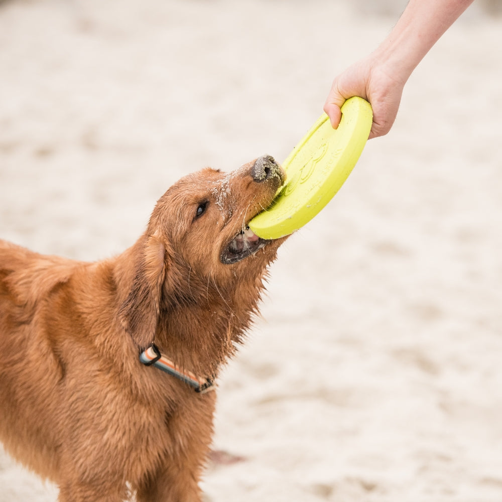 De Zisc is gemakkelijk op te rapen van vlakke oppervlakten en is zeer uitdagend vanwege het zweven en stuiteren. Bovendien blijft de Zisc drijven op het water en is hij vaatwasserbestendig waardoor hij gemakkelijk schoon te houden is. De Zogoflex Zisc is ook aan te raden voor pups, door het flexibele materiaal zullen de tanden niet beschadigen.