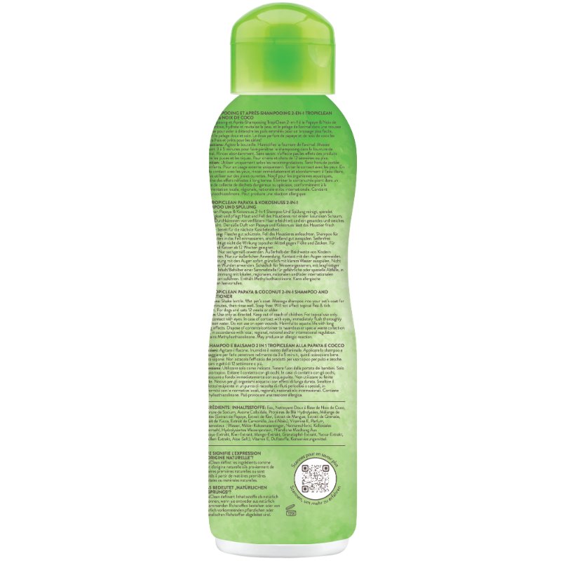 TropiClean Papaya & Kokosnuss 2-in-1 Shampoo und Spülung reinigt, spendet Feuchtigkeit und pflegt Haut und Fell von Hunden und Katzen. Die Kombination aus Papaya und Kokos sorgt für eine effektive Reinigung, während das Fell mit Feuchtigkeit versorgt und genährt wird. Dank der konditionierenden Wirkung werden Verfilzungen reduziert und das Fell bleibt geschmeidig und glänzend. Geeignet für Hunde und Katzen und ideal für die regelmäßige Anwendung.