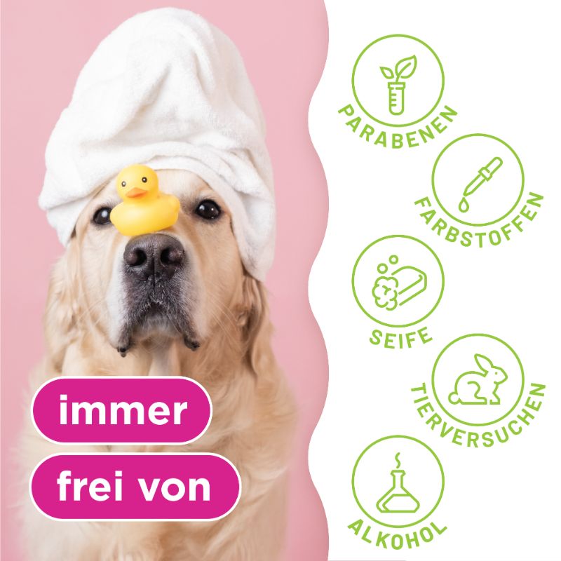 Gut schütteln. Fell nass machen und Shampoo 3–5 Minuten lang einmassieren. Gründlich ausspülen. Kontakt mit den Augen vermeiden. Für den täglichen Gebrauch geeignet.