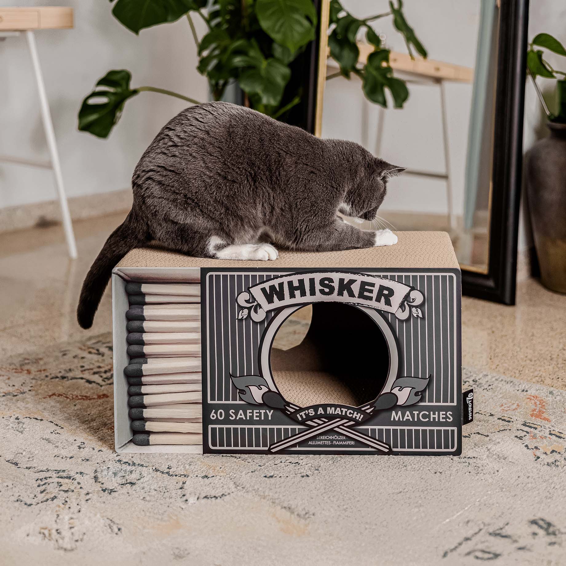 Dieses Design von District 70 ist wieder einmal ein echter Hingucker im Haus. Das Kratzmöbel WHISKER in Form einer Streichholzschachtel bietet ausreichend Platz für ein schönes Nickerchen, zum Strecken und Kratzen der Nägel und um anschließend noch stundenlang weiterzuschlafen.