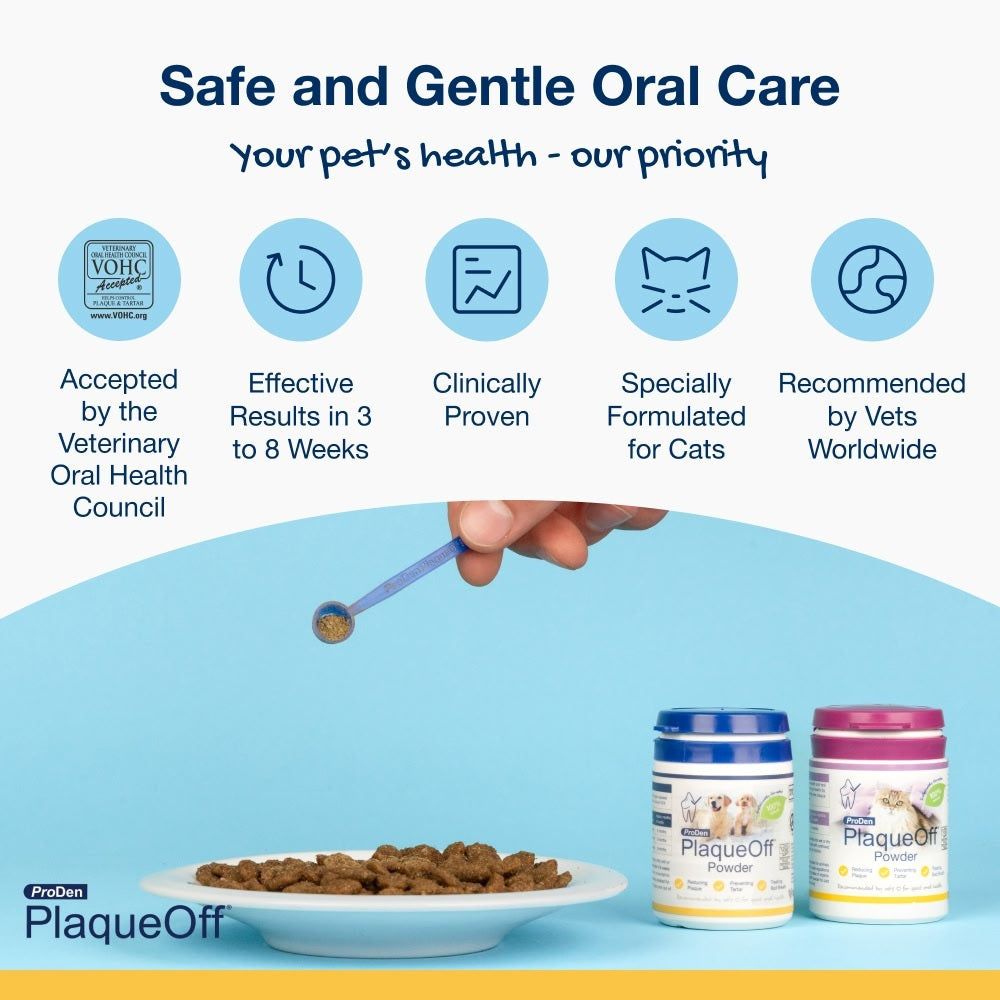 PlaqueOff ist ein organisches und 100 % natürliches Pulver. Einmal täglich über Trocken- oder Nassfutter streuen für frischen Atem und reduziert Plaque. PlaqueOff® macht vorhandenen Zahnstein weich, erleichtert dessen Entfernung und beugt neuer Zahnsteinbildung vor.