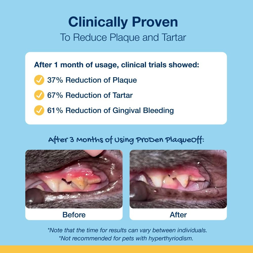 Viele Besitzer scheuen das Zähneputzen bei Hunden oder Katzen oder kommen nicht oft genug dazu. ProDen PlaqueOff® ist die Lösung. Es ist einfach und effektiv: Einmal täglich über das Futter streuen – schon wirkt es.